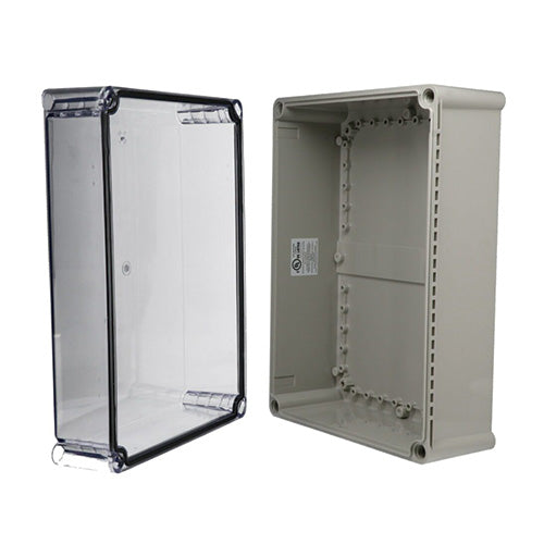 ABS/PC blended plastic enclosures are molded out of light gray material with UL94-5VA flammability rating. Suggested service temperature range -40C to +70C.